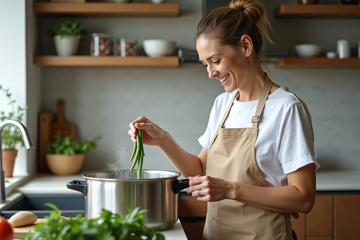 Plusieurs modes de cuisson sont possibles, chacun avec ses atouts. À l’eau bouillante salée, le temps varie de 4 à 15 minutes : plus vous prolongez, plus la couleur pâlit, plus la texture s’affadit. La vapeur douce ou la cocotte-minute prennent l’avantage si l’on vise des haricots verts éclatants, riches en vitamines, avec ce petit croquant qui fait la différence. La cocotte-minute règle l’affaire en 2 à 5 minutes sous pression : efficacité redoutable pour garder du nerf au légume.